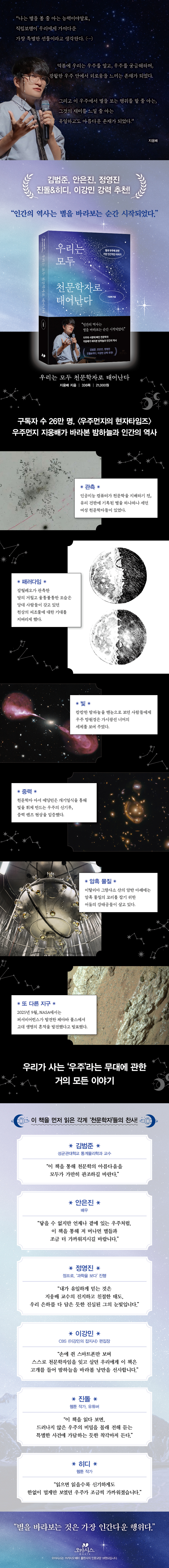 “손에 쥔 스마트폰만 보며 스스로 천문학자임을 잊고 살던 우리에게 이 책은 고개를 들어 밤하늘을 바라볼 낭만을 선사합니다.”_이강민(CBS 〈이강민의 잡지사〉 편집장)