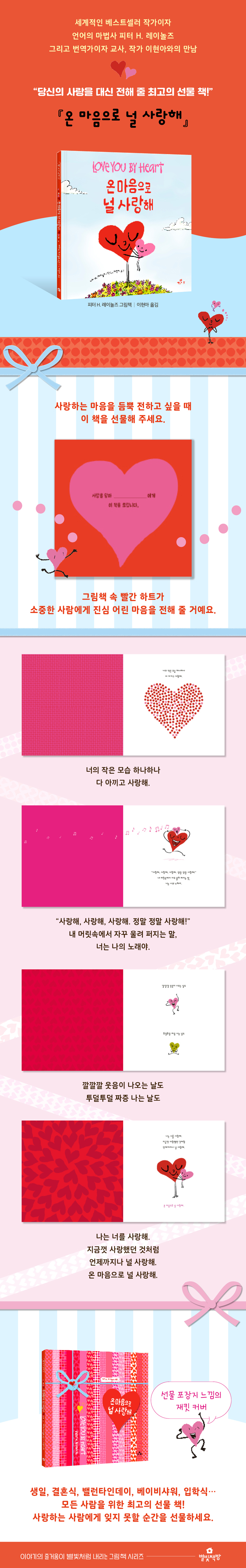 《온 마음으로 널 사랑해》엔 피터 레이놀즈가 조건 없는 사랑에 대해 말하는 방식이 고스란히 담겨 있다. 평소에 우리가 선뜻 하지 못하는 말들이, 쉽지만 깊게 새겨져 있는 이 책을 꼭 만나 보기 바란다.