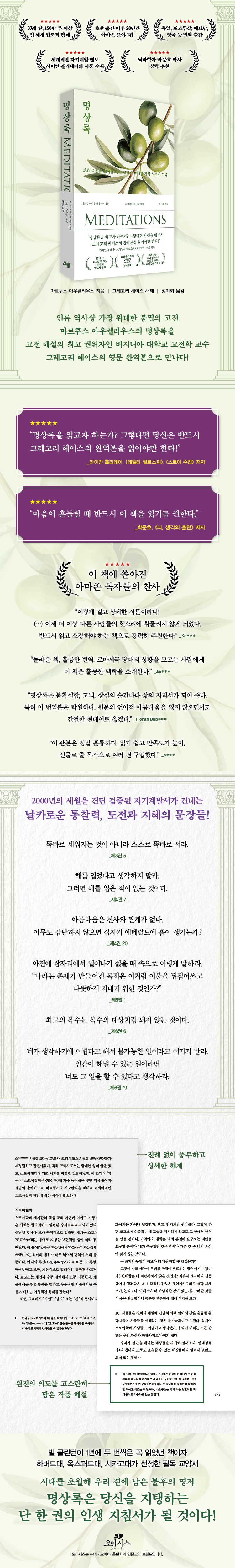 《명상록》은 나에게 역사상 가장 위대한 책이다. 자기 통제, 개인의 윤리, 인류애, 자기객관화, 통제에 대한 더없이 완벽한 책이다. 《명상록》을 읽고자 하는가? 그렇다면 당신은 반드시 그레고리 헤이스의 완역본을 읽어야만 한다.